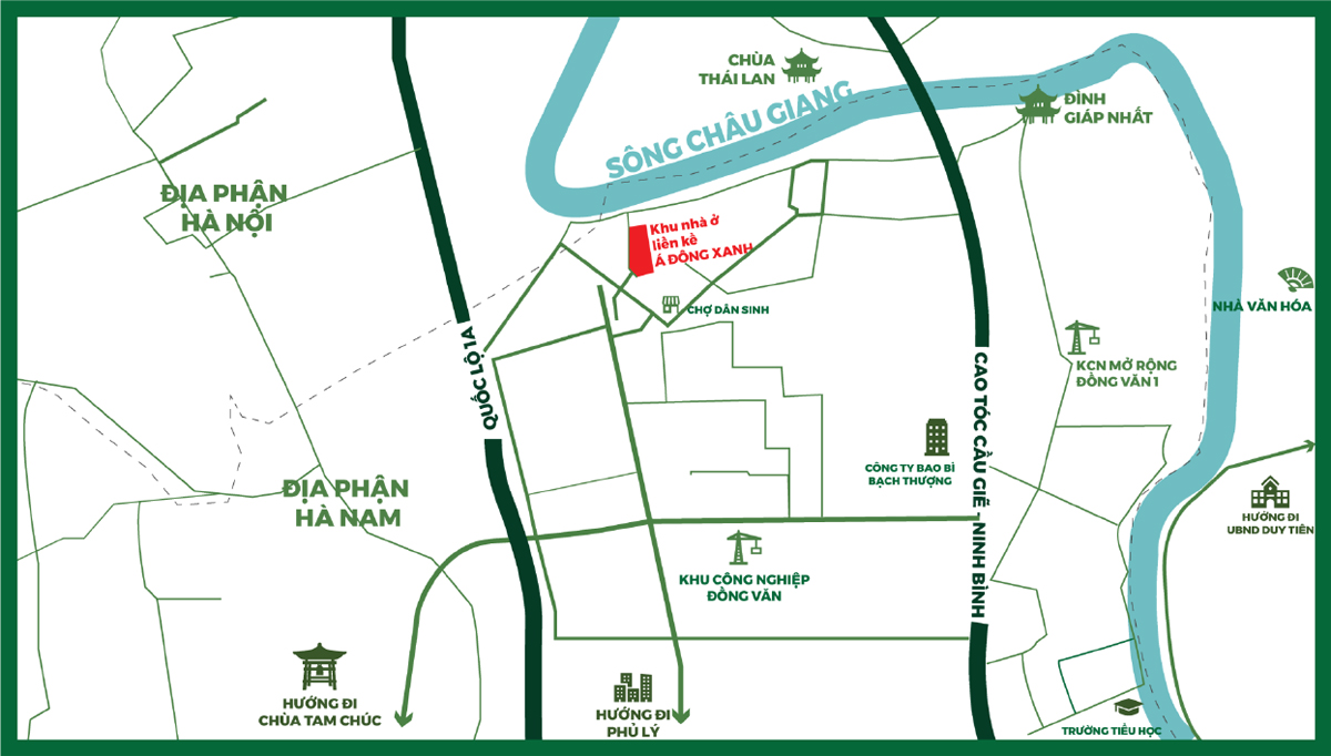 Dự án Á Đông Xanh sở hữu vị trí đắc địa bậc nhất khu vực, tiếp giáp ngay Khu công nghiệp Đồng Văn II, cách Quốc lộ 1A chỉ 0,5km, cách đường cao tốc Hà Nội – Ninh Bình 1km và được coi như điểm chung chuyển giữa Hà Nam với Thủ đô Hà Nội.